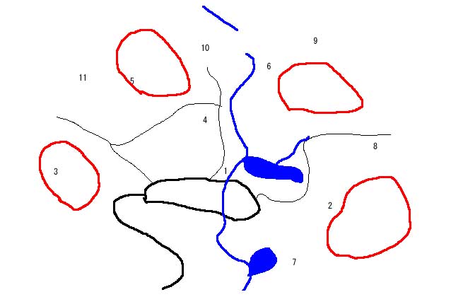 と村長の地図に書き込んで行く。どうやら8〜11の場所にゲルグの小屋があるらしい。
