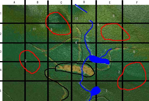 赤で囲まれた場所:ホズが罠を仕掛けたっぽいところ