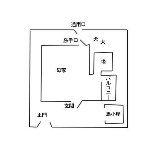 塔には、表から見えたものとは別にもう一つ窓があった。閉まっている。位置関係は、表側の窓の丁度裏手で少し下になる。また、母家の 2 階から塔をつなぐ渡り廊下がある。渡り廊下は、裏側の窓のさらに下に当たる。その下は、高さ 3 メートルのレンガ造りの塀に阻まれて見えなかった。