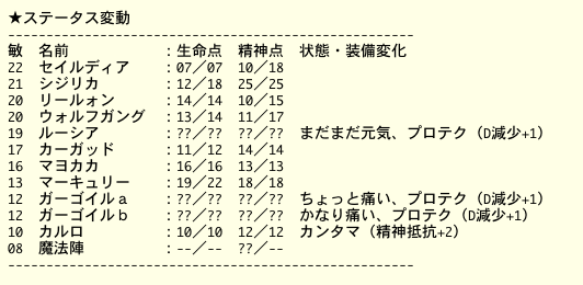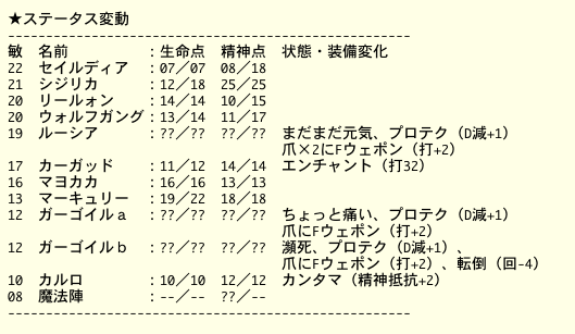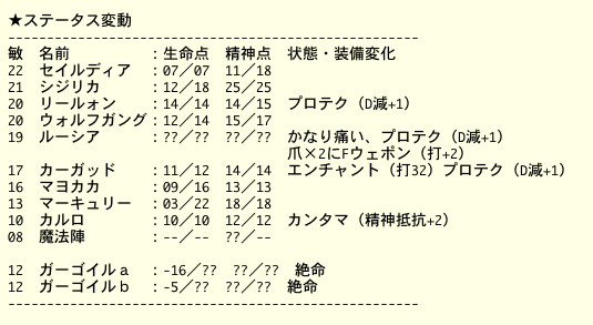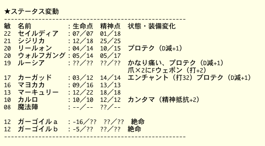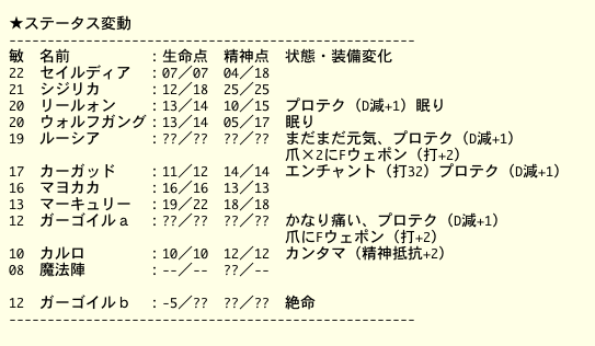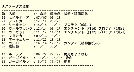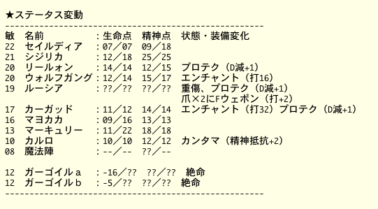 そして、ルーンマスターは己の魔力が回復していくのを感じた。(セイル精神点1→11)(ウォルフ精神点5→15)(リールォン精神点4→14)